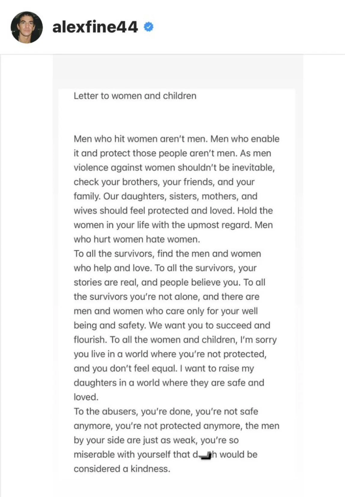 Shortly after CNN released the hotel surveillance footage, Fine shared an image of a self-written letter about domestic violence on Instagram. Fine said in the caption to have written the letter.